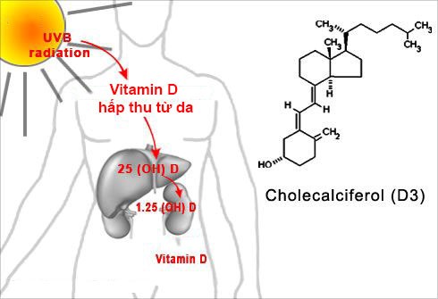 Sau khi được ánh nắng mặt trời chiếu sáng các tiền chất sẽ chuyển thành vitamin D3 tích lũy ở dưới da rồi được chuyển vào máu. Phần lớn vitamin D3 chuyển hóa tại gan thận chỉ có 1 lượng nhỏ được dự trữ trong cơ và trong tế bào mô mỡ.