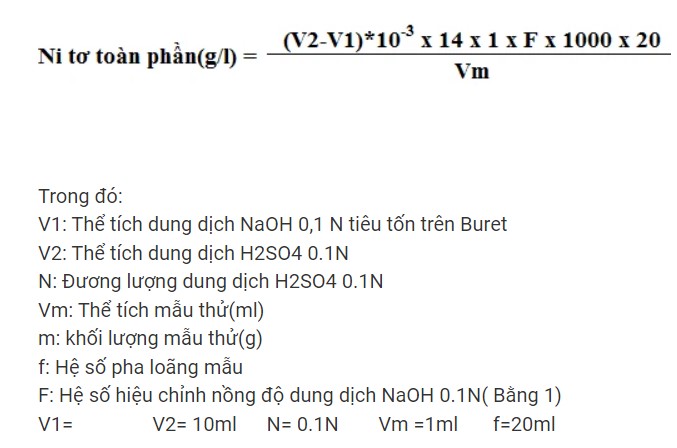 - Hàm lượng Ni tơ toàn phần được tính theo Công thức sau: