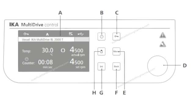 | D | Nút điều khiển (xoay/nhấn) | Cài đặt tốc độ.Điều hướng, chọn và thay đổi các cài đặt.Bắt đầu/dừng vận hành thiết bị. |