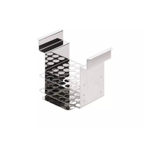 The test glass insert 100 x 17 mm ø made of stainless steel is suitable for temperatures up to 150°C. A maximum of 30 test tubes can be placed.